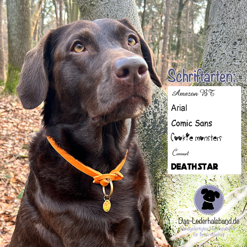 Du kannst zwischen verschiedeen Designs und Schriftarten wählen - und neben den Namen deines Hundes auch deine Handynummer eingravieren lassen.